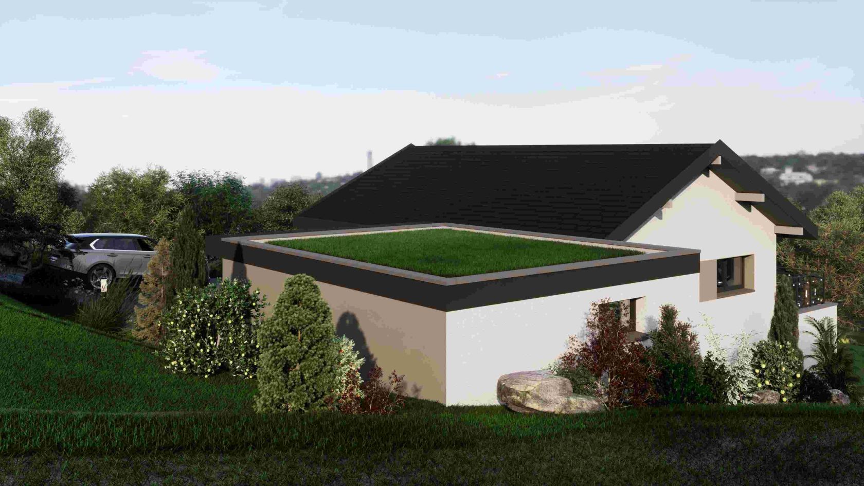Pour parfaire cette conception, un grand garage permettra d’abriter vos 2 véhicules.